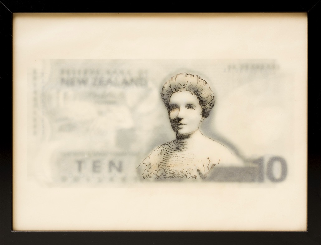 frauen auf banknoten, kate sheppard, neuseeland | 30 x 40 cm | enkaustik, fototransfer | 2018
